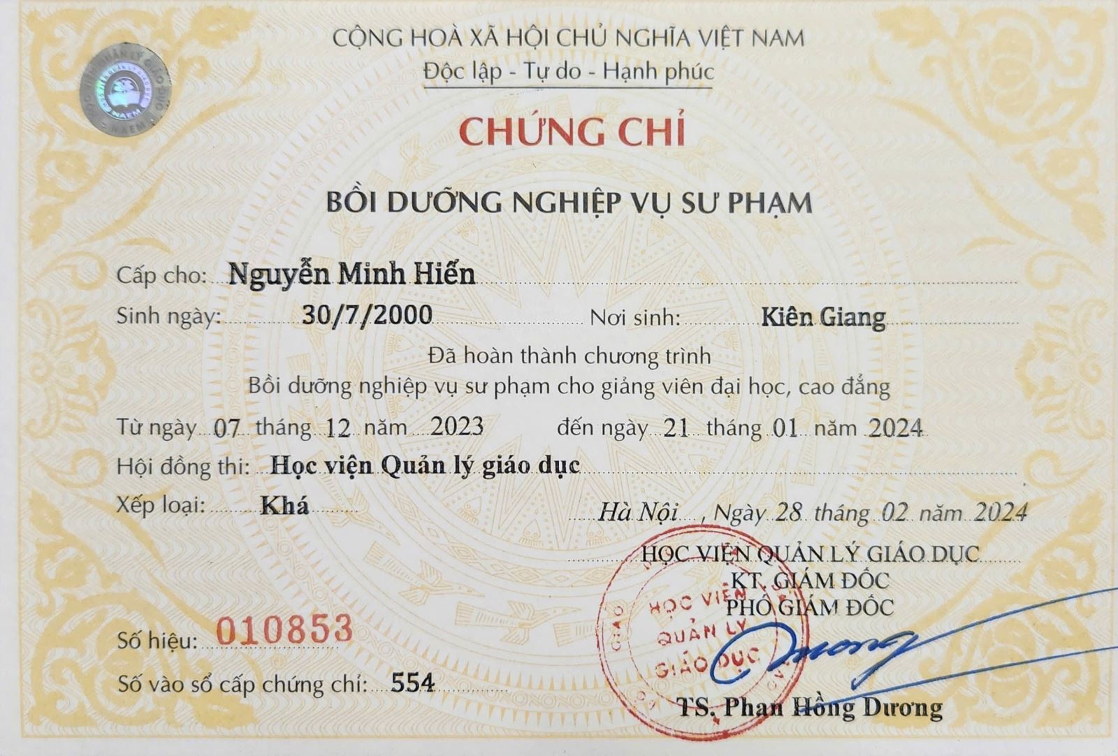 Certificate of Pedagogical Proficiency - Ms. Thanh Nhan