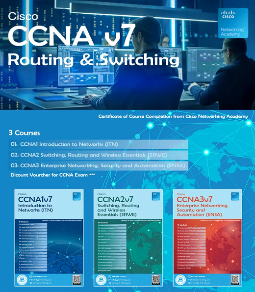 Với phiên bản CCNA mới nhất phiên bản 7, các bạn sẽ được học 3 học phần, thay vì 4 học phần như phiên bản cũ, đó là phần 1 – Introduction to Network, phần 2 – Switching, Routing, Wireless và phần 3 - Enterprise Networking, Security, and Automationv7.0. Mỗi học phần có từ 15 đến 17 module, bao gồm các kiến thức cơ bản về mạng máy tính, các vấn đề liên quan đến địa chỉ ipv4 và ipv6, các giao thức định tuyến cơ bản như: Ripv2, EIGRP, OSPF đơn vùng, NAT, bảo mật trên thiết bị tường lửa Cisco ASA. Ngoài ra, khi đến với Trung tâm Đào tạo Công Nghệ Thông Tin Quang Việt, các bạn có thể đăng ký khóa học CCNAv7 Plus để được trang bị thêm các kỹ năng lab thật nâng cao trong 3 buổi về CCNP như định tuyến BGP, OSPF đa vùng, Routing Vlan trên Switch layer 3 tạo tiền đề cho việc học chứng chỉ CCNP được thuận lợi hơn, dễ học hơn và dễ tiếp thu hơn.